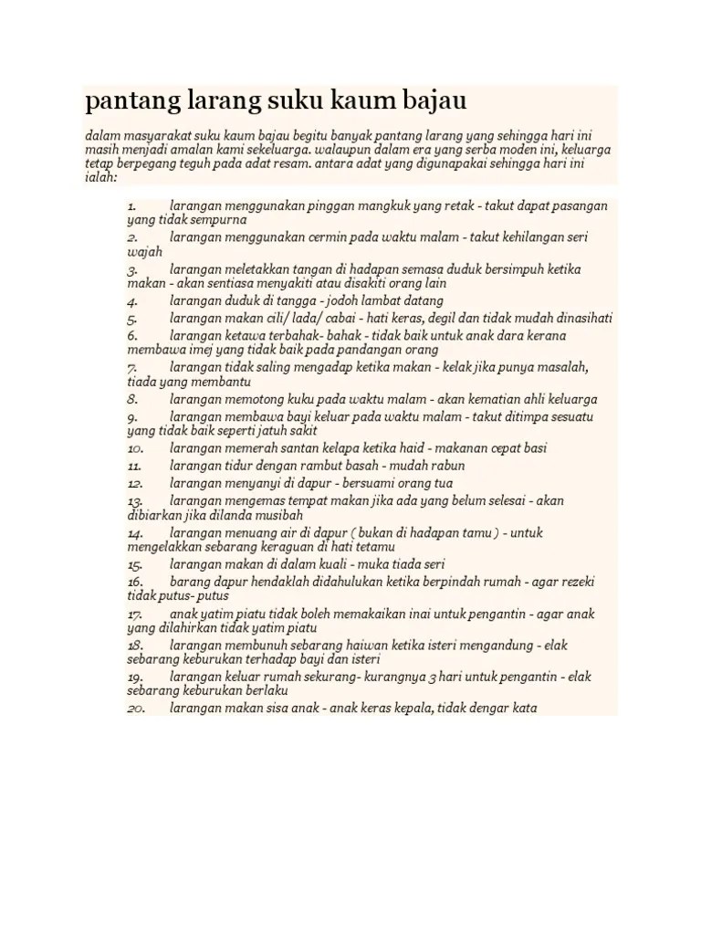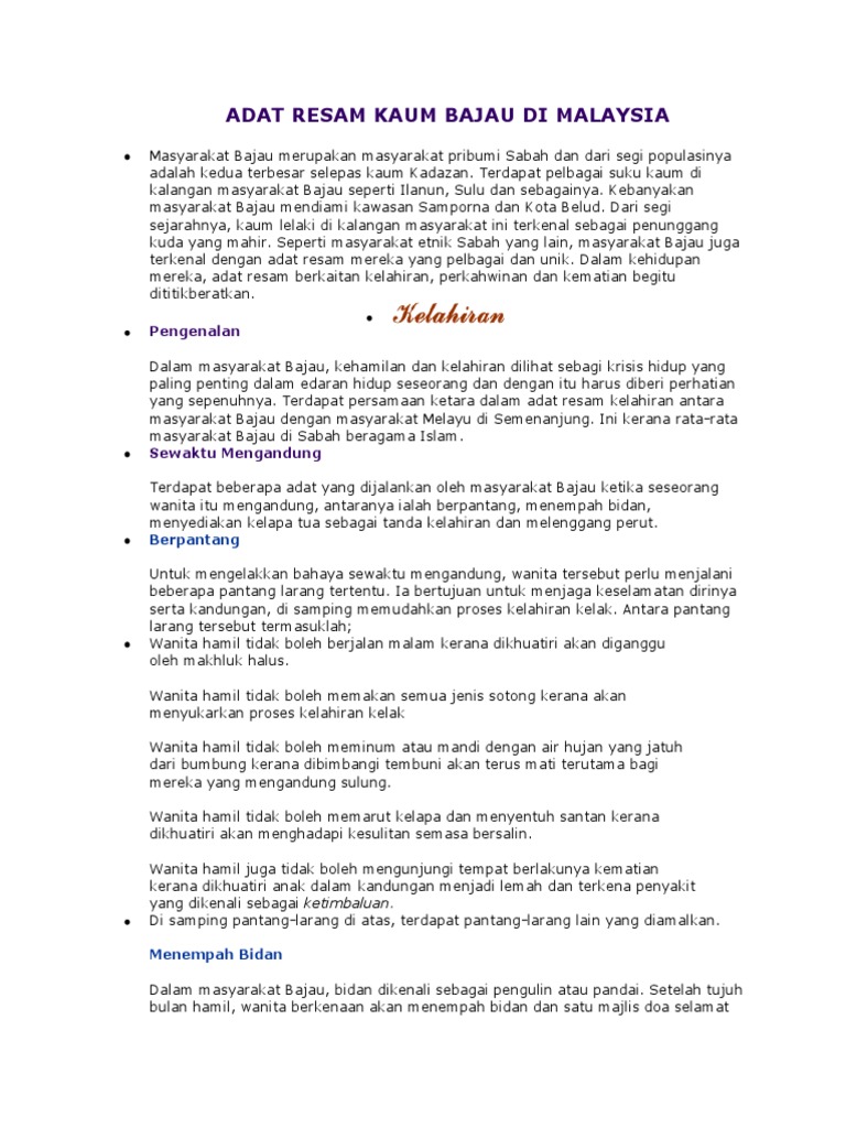 Perayaan Kaum Bajau from imgv2-1-f.scribdassets.com This culture is known as 'bertitik'. Setiap bulan, pasti ada kegiatan dan upacara tertentu serta dewanya yang berlainan untuk dipuja. Kajian terhadap suku kaum bajau masih belum begitu meluas. Bajau dan kumpulan yang sama telah menetap di pantai barat dan timur sabah sejak beberapa ratus tahun dan diiktiraf sebagai penduduk asli dan antara bumiputera terbesar di negeri ѕabah dan sekitarnya. Terdapat beberapa adat yang dijalankan oleh masyarakat bajau ketika seseorang wanita itu. Masyarakat bajau dan adat perkahwinan: Kaum perempuan bajau kudat terkenal dengan tenunan kain pis iaitu kain dastar ikat kepala. Namun terdapat adat resam tempatan yang ditambah.