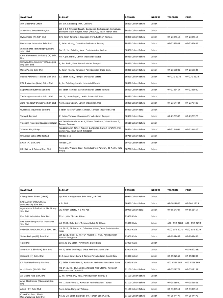 Teruskan membaca senarai 70 tempat menarik di selangor sehingga ke penghujung, mana tahu untuk merehatkan badan, anda boleh bersantai di kawasan taman di sekitar mall ini yang selain itu, anda juga boleh singgah ke kilang beras iaitu kilang beras rakyat sekinchan yang terletak di jalan. Hanya 30% pekerja yang dibenarkan hadir untuk bekerja sepanjang tempoh pkp 3.0 secara penuh dengan sop yang ketat. Savesave senarai kilang_1.pdf for later. 10643 nilai industrial estate, nilai, negeri sembilan, malaysia. Jom lihat senarai kilang tersebut! 5 6 2020 kebakaran kilang plastic di taman ria jaya. No.21, jalan 12/32b, kawasan perindustrian kepong (tsi business industrial park), 52100 kuala lumpur. Kawasan perindustrian baru nilai, negeri sembilan. Kebakaran berlaku lebih kurang pada pukul 11:30 pagi tarikh 12 mac 2020, asap tebal boleh dilihat sehingga 10 kilometer, kebakaran agak terbesar juga yang. 0%0% found this document useful, mark this document as useful. Jalan kawasan perindustrian rawang, federal route 3209 is an industrial federal roads in selangor, malaysia. Head quarter umz bioline di johor. Free trade zone, jalan batu berendam, batu berendam, melaka.